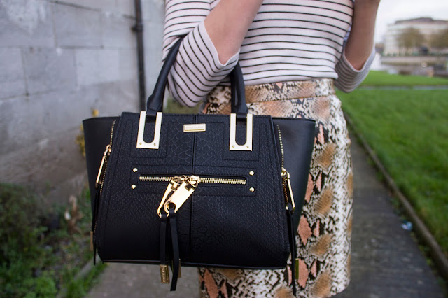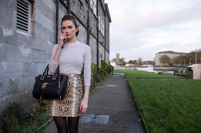 Also, to mention the outfit, this was a totally accidental print clash, but I think it looks great. Stripes are always a great print to mix with as they’re kind of just a basic so they look great with leopard print, florals, a contrasting stripe, or as you can see here, snakeskin.